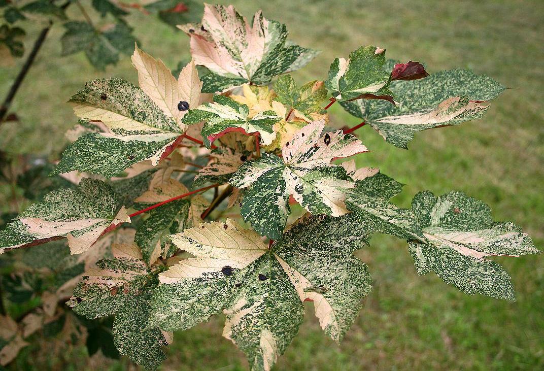 Клен Nizetii - сорт с молодыми листьями светло-карминно-красного цвета, позже темно-пурпуровые с желтыми и зелеными пятнами.