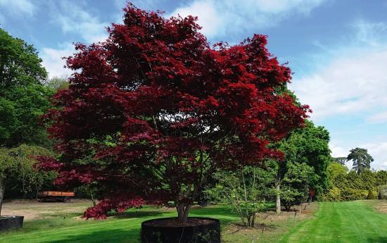 Взрослые крупномеры достигают высоты в 5-6 м. Главная прелесть растения в широких зазубренных листьях, которые меняют окраску, от красной до темно-багровой. Крона принимает округлую слегка несимметричную форму. Клен цветет пурпурными соцветиями, в конце весны.