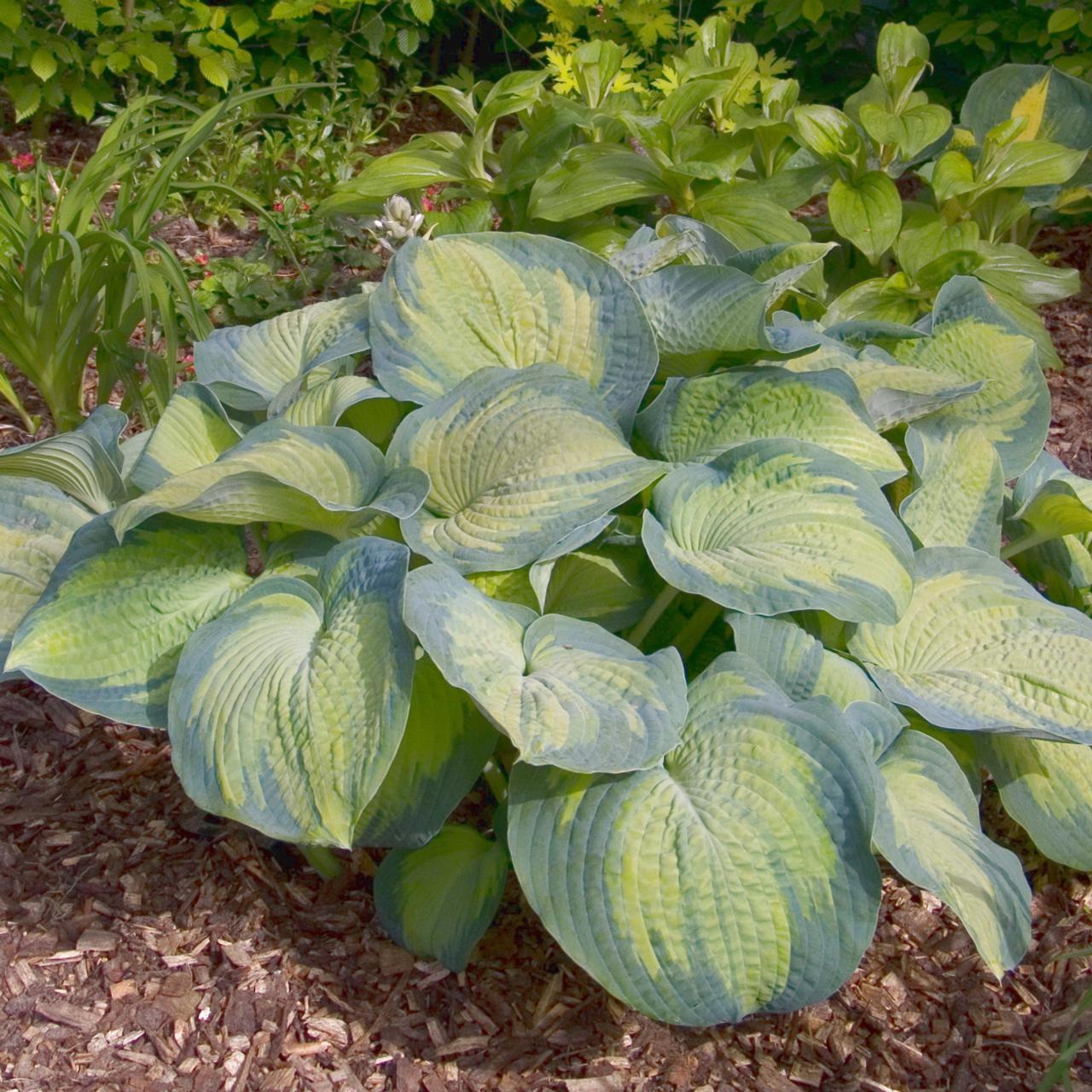 Хоста гибридная Марджиз Эйнджел - высота растения 70 см, диаметр куста во взрослом состоянии 100 см. У данного сорта листья жёлтые с широкой голубовато-сизой каймой.