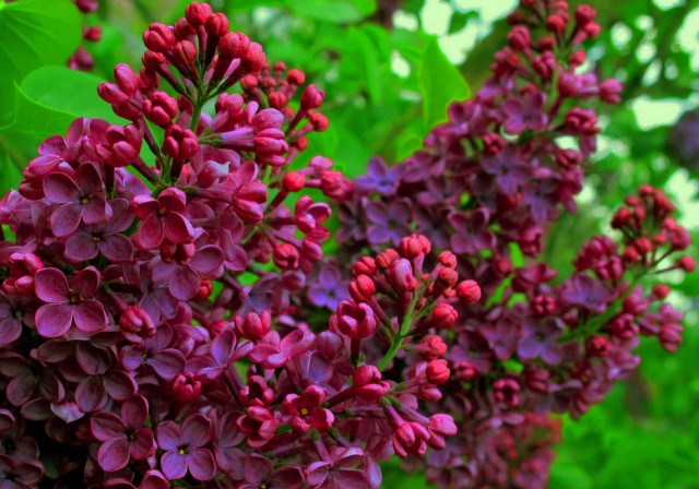 Пора цветения наступает поздно. Соцветия широкие, в форме пирамиды. Форма цветочков простая, окрас сочный и яркий, в полуроспуске пурпурно-красный, а распустившись, становятся лиловыми. Цветет обильно и очень красиво.
